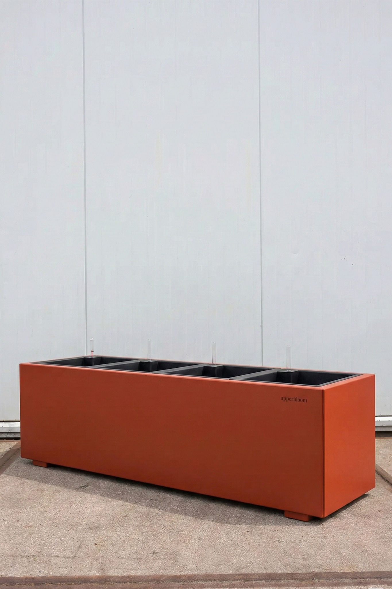 Lange plantenbak van verzinkt staal (1573×440×404 mm) met 4 binnenbakken. Duurzaam, strak en perfect als groene scheiding of gevelaccent.