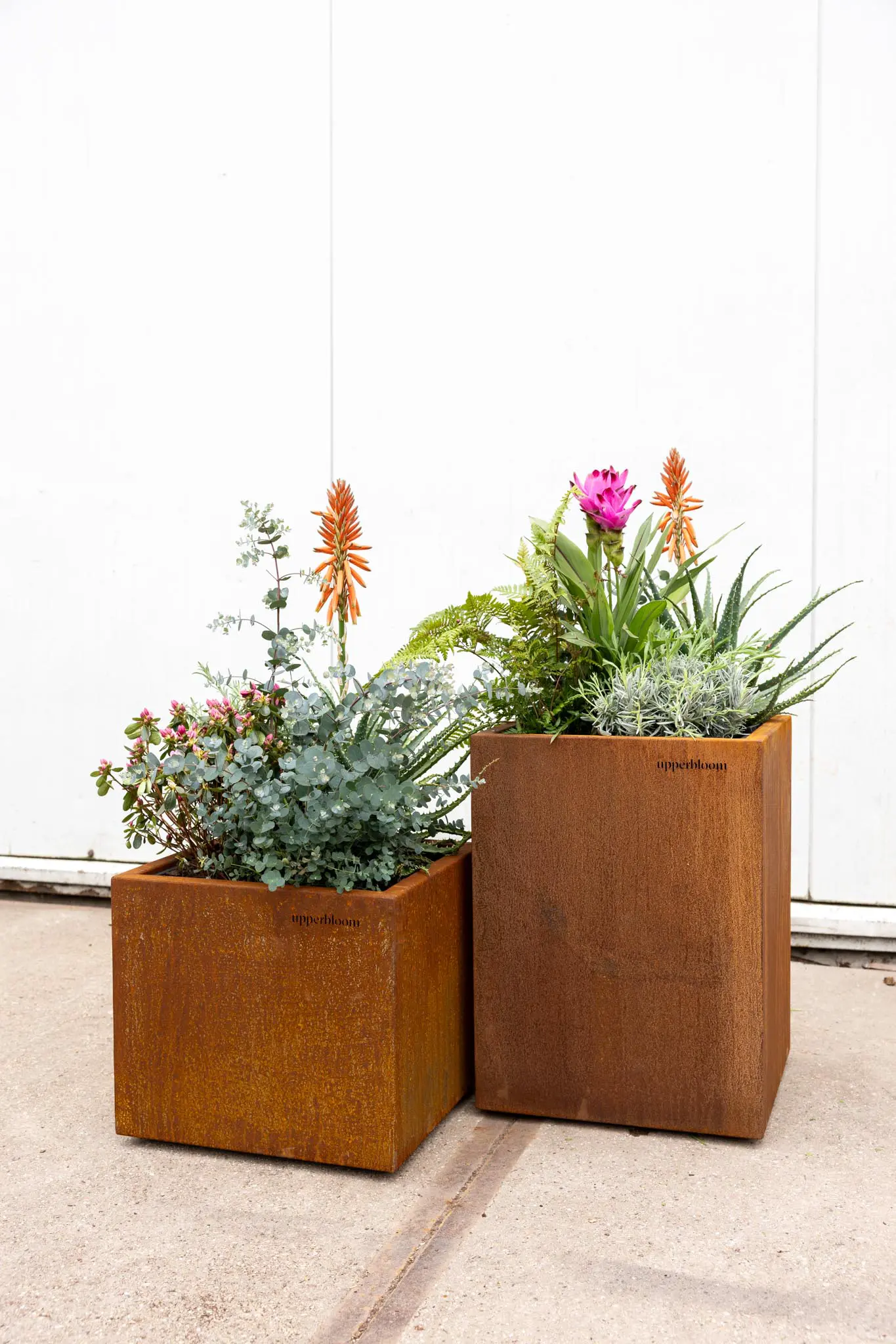 De Cube Duo Set in cortenstaal combineert de lage Cube 40 met de hoge Cube 80 in één harmonieuze set. De natuurlijke roestkleur van het cortenstaal geeft direct warmte en textuur aan je buitenruimte. Deze set is ideaal voor entrees, hoeken of als losse eyecatchers op een terras. Door de slimme binnenbakken met waterreservoir zijn de bakken eenvoudig in onderhoud én geschikt voor seizoensbeplanting.