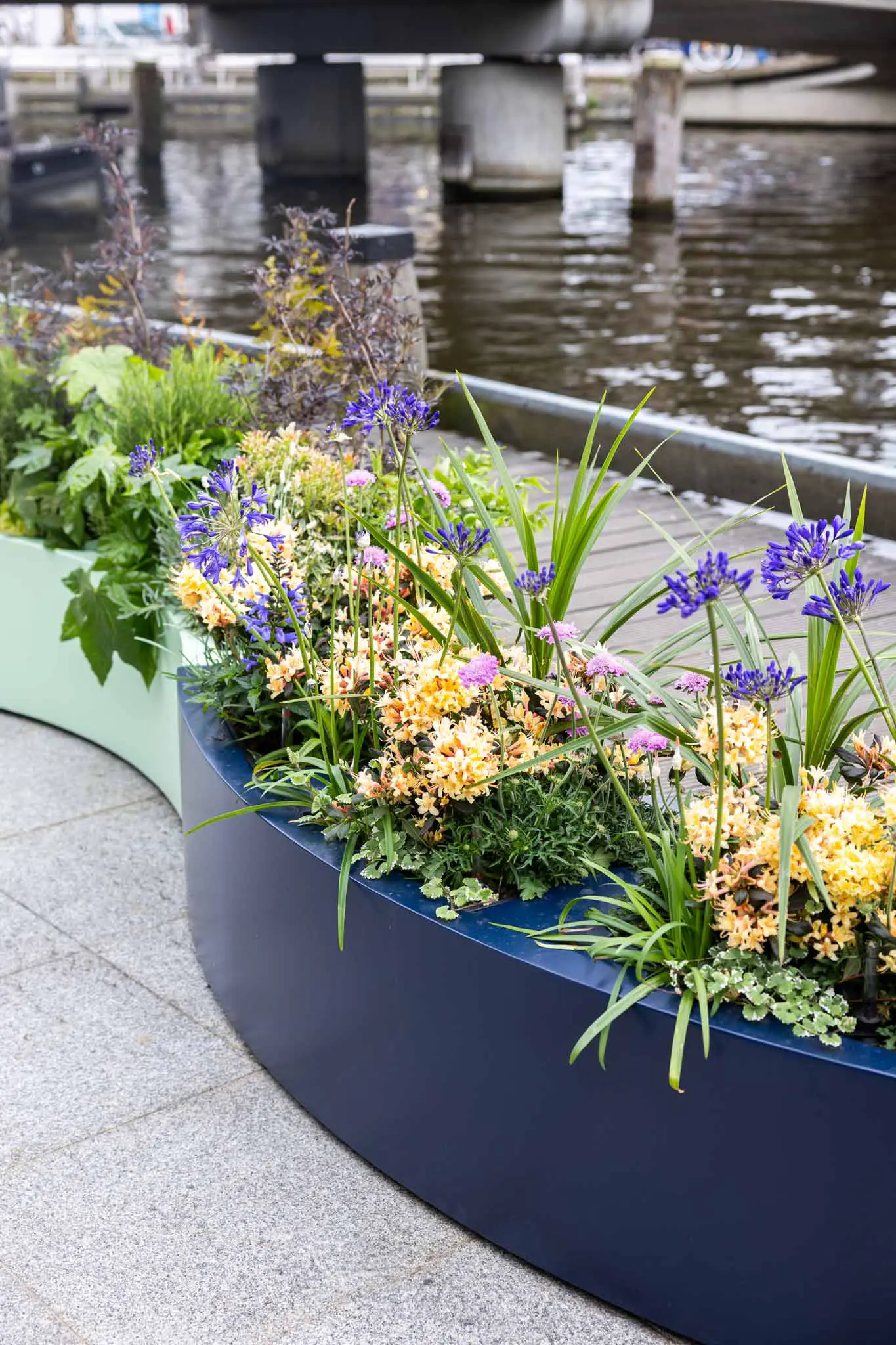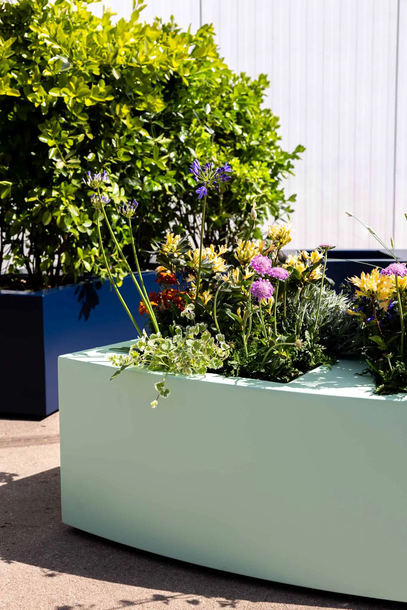 Halve‑maanvormige plantenbak van aluminium, voorzien van drie binnenbakken en gepoedercoat in RAL‑kleur. Design en functie in één.