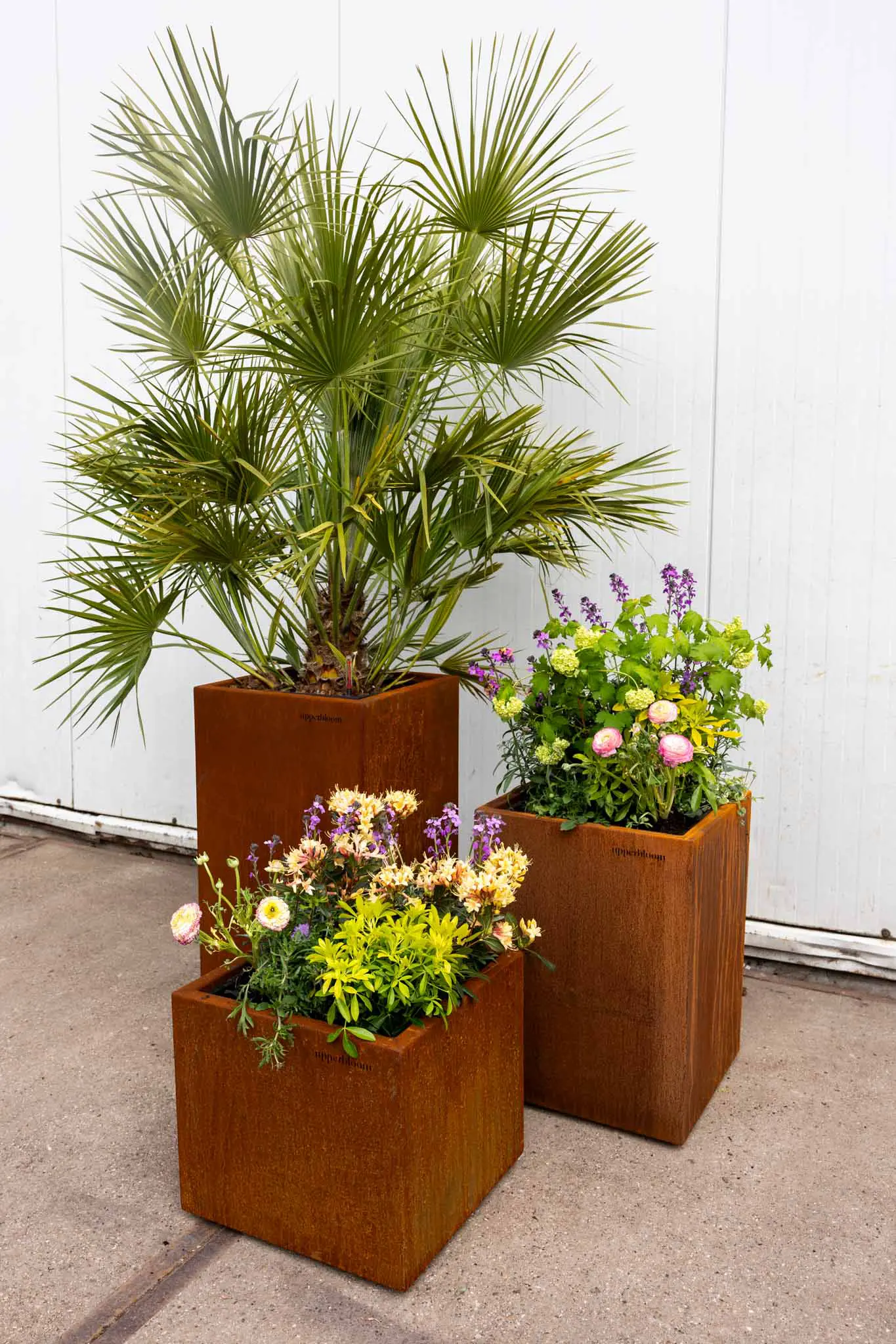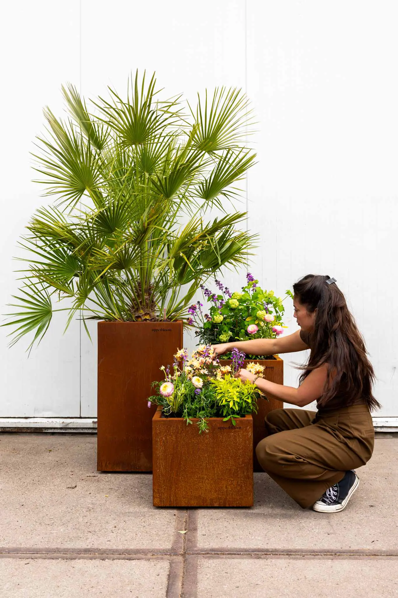 De Cube 80 van Upperbloom is een hoge plantenbak van 80 cm, gemaakt van robuust cortenstaal. Het materiaal vormt na verloop van tijd een natuurlijke roestkleurige patina, wat zorgt voor een stoere en unieke uitstraling.
