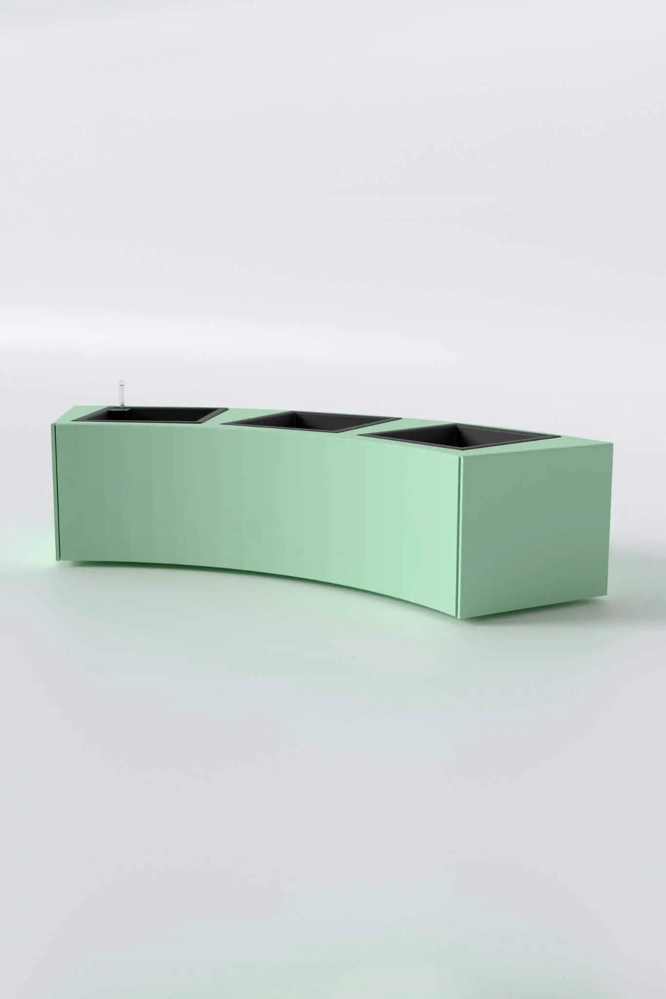 Halve‑maanvormige plantenbak van aluminium, voorzien van drie binnenbakken en gepoedercoat in RAL‑kleur. Design en functie in één.