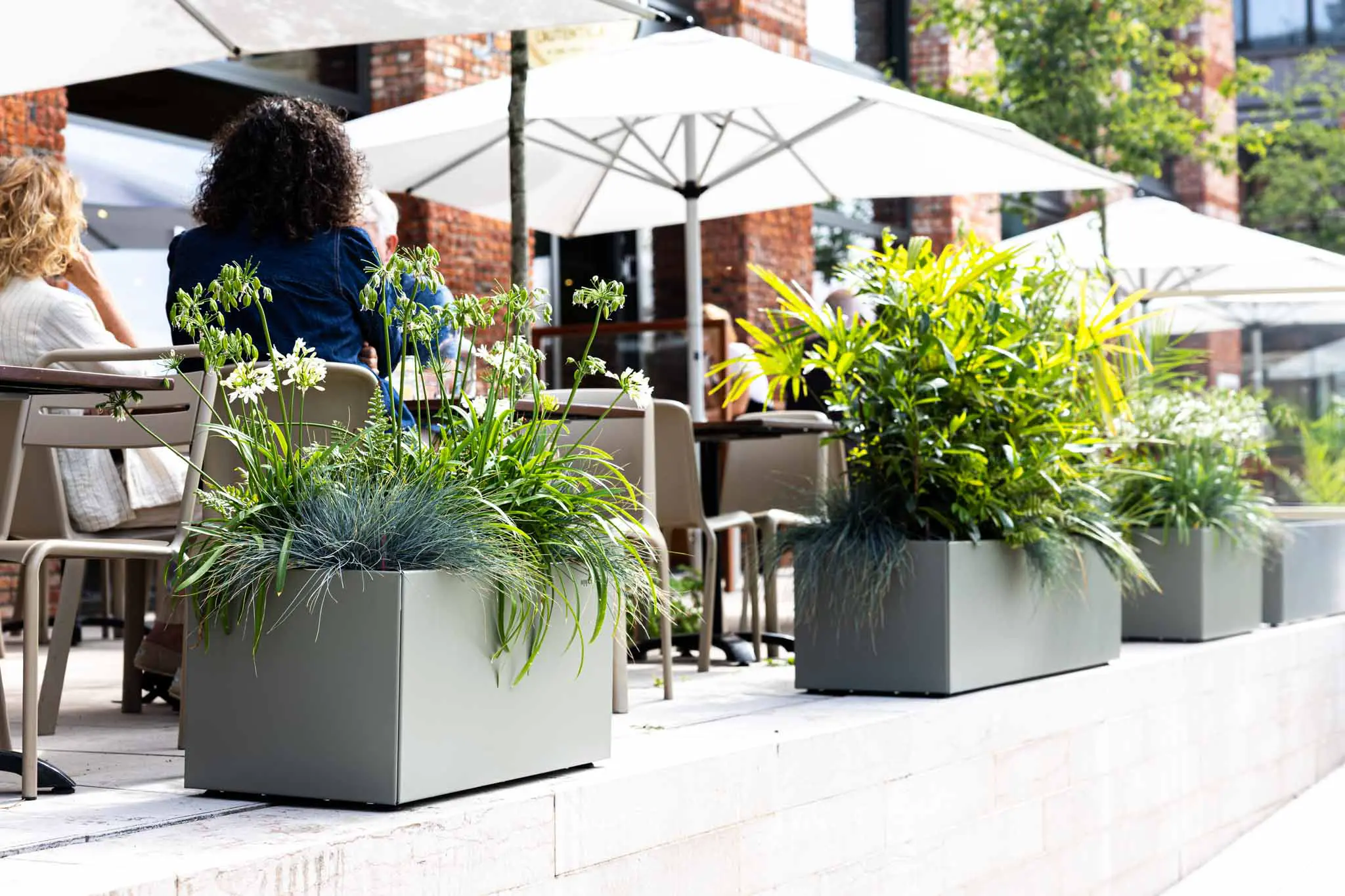 Papillon is een bruisend Bakery-Café en Restaurant in Amsterdam-Noord, op een steenworp afstand van de NDSM-werf. Met een eigen bakkerij en mediterrane keuken is het een geliefde plek voor buurtbewoners én bezoekers van de stad. Het terras ligt in een nieuwe, grotendeels versteende wijk waar groen hard nodig was om sfeer en warmte toe te voegen. De wens: lage plantenbakken langs de rand van het grote terras, zodat het uitzicht open bleef, maar gasten toch beschutting en geborgenheid ervaren. Extra belangrijk, omdat het terras deels op een trapconstructie ligt.