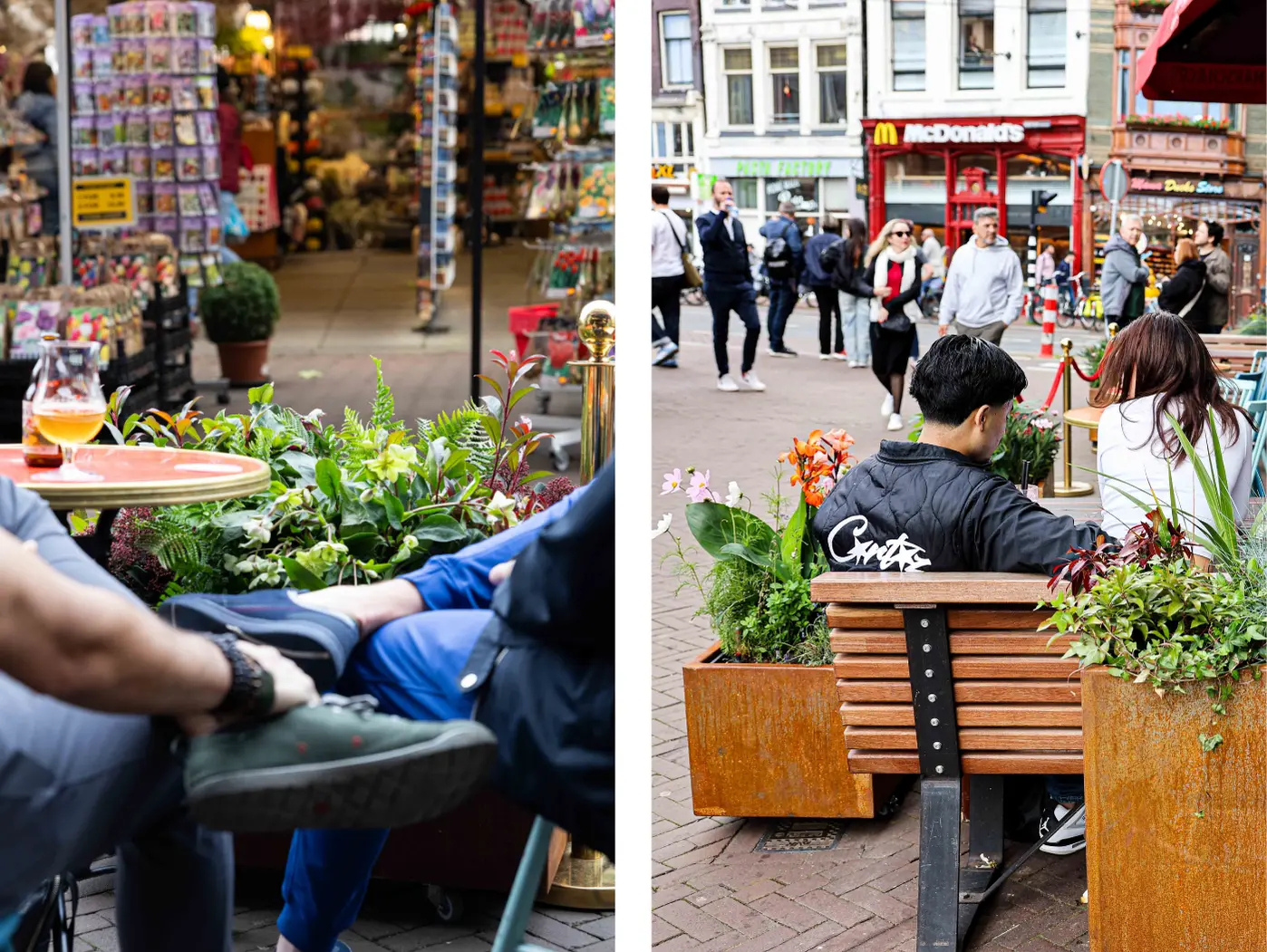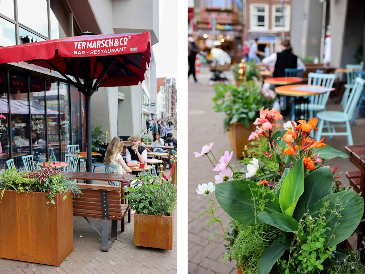 Voor het terras van Ter Marsch & Co leverden wij onze Brick 40 en Brick 80 plantenbakken als stijlvolle afscheidingen. We kozen voor een mix van seizoens- en groene arrangementen, perfect passend bij de bloemrijke omgeving. Het groen biedt niet alleen een frisse uitstraling maar creëert ook een comfortabele setting midden in de stadsdrukte.